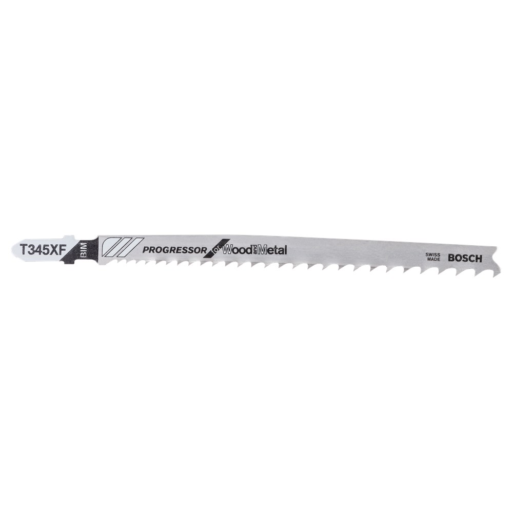 Het T 345 XF Progressor for Wood and Metal decoupeerzaagblad biedt snelle en rechte zaagsneden in dun en dik hout met metaal. De tandgeometrie met een steeds groter wordende tandafstand maakt werken op materialen met uiteenlopende dichtheden mogelijk. Bovendien zijn de gefreesde, gezette tanden ontworpen voor snelle zaagsneden. De volledig geharde HSS (high-speed steel) vertanding van BIM (bimetaal) zit vast aan een zeer elastisch HCS (high carbon steel) lichaam dat het blad geschikt maakt voor het zagen door hout met metaal en stalen componenten van een standaardsterkte. Het blad heeft een grote progressieve tandafstand (2,4 - 5mm) en lange lengte (132mm) en zaagt door diverse soorten hout met metaal van maximaal 65mm dik, bijv. zachte spijkers, schroeven en zachte bevestigingsmaterialen.