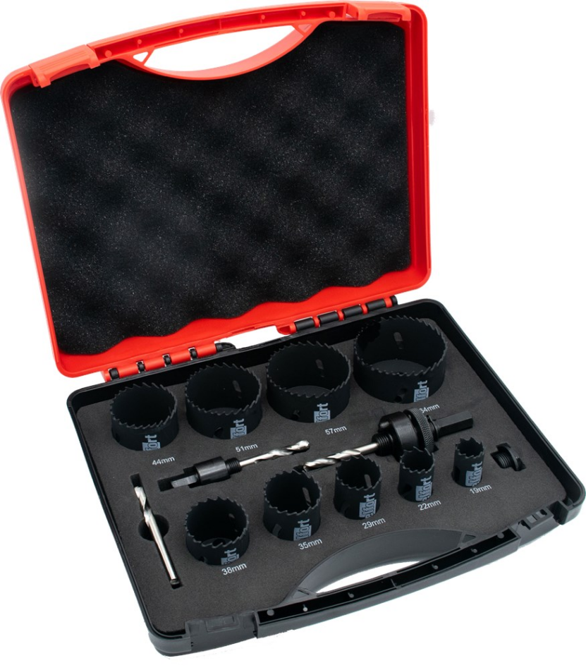 13-delig. Bestaande uit gatzagen 19, 22, 29, 35, 38, 44, 51, 57 en 64 mm, 2 gatzaaghouders, 1 verloopnippel en extra centreerboor.