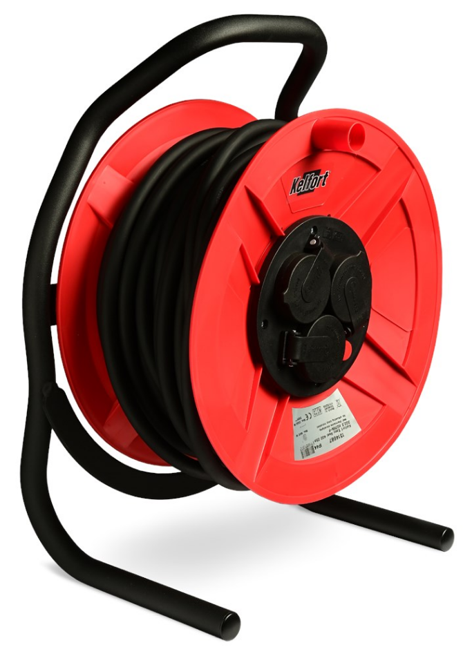 Easy Reel 400. Kunststof haspel met geëpoxeerd stalen buisframe 16x1,5 mm. Dwarsgeplaatste handgreep. Voorzien van speciaal ontworpen frame dat voorkomt dat de kabel vast loopt tussen spoel en frame, drievoudige contactdoos 250 V / 16 A met beschermingscontact IP44, thermische beveiliging en neopreen kabel H07 RN-F.