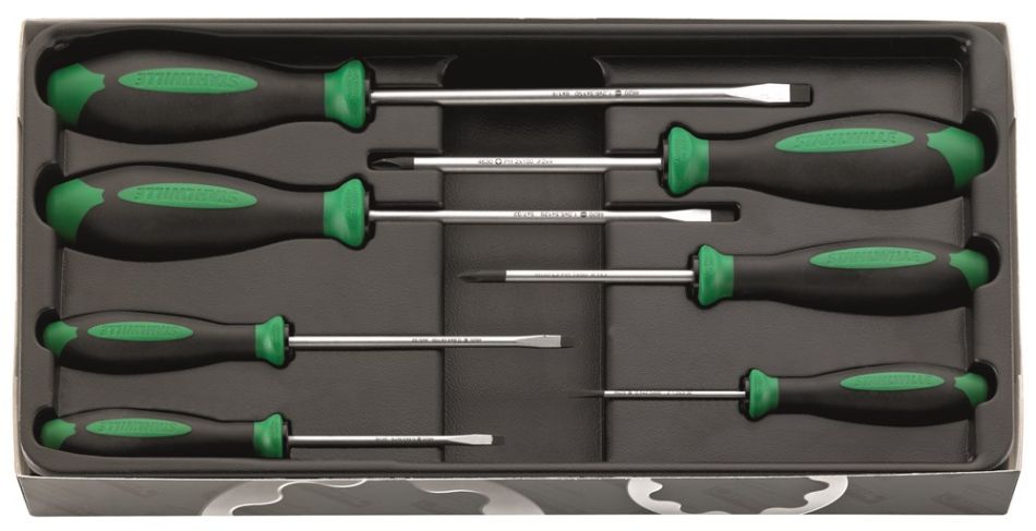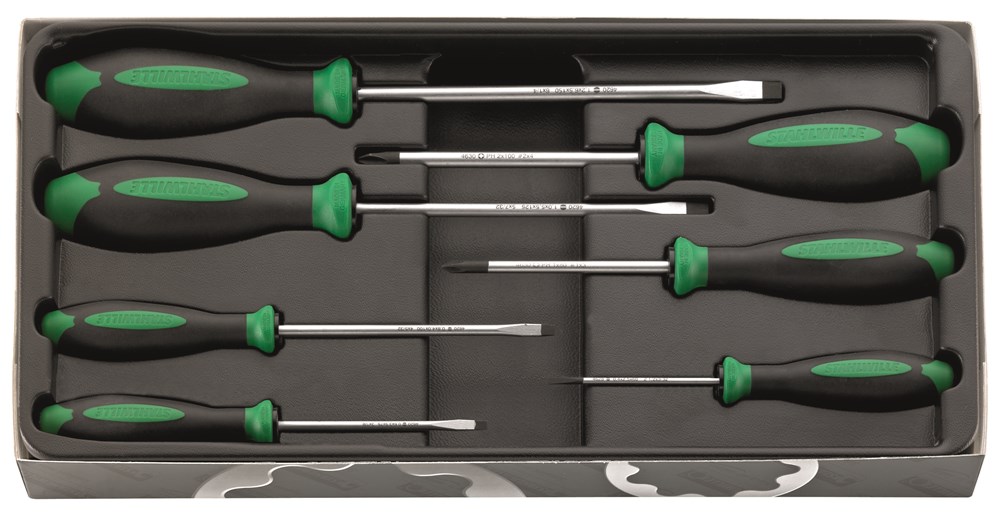 7-delig, inhoud: 4620: gr. 1 (0,6 x 3,5 x 75 mm), gr. 2 (0,8 x 4,0 x 100 mm), gr. 3 (1,0 x 5,5 x 125 mm), gr. 4 (1,2 x 6,5 x 150 mm); 4628: gr. 1 (0,4 x 2,5 x 60 mm); 4630: gr. 1; gr. 2.