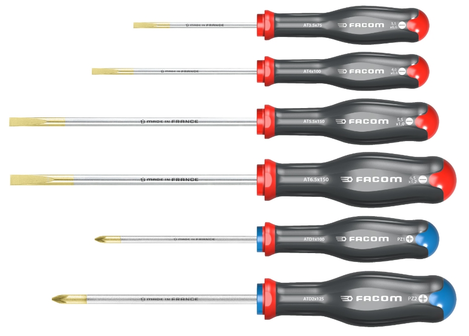 Chroom-molybdeen-vanadiumstaal met zwarte punt, ergonomisch gevormd, 2-componentenhecht voor optimale grip. Bestaande uit: schroevendraaiers pozidriv 0,1 en 2. schroevendraaiers voor zaagsnede 3x80, 4x100, 5,5x125 en 6,5x150 mm.