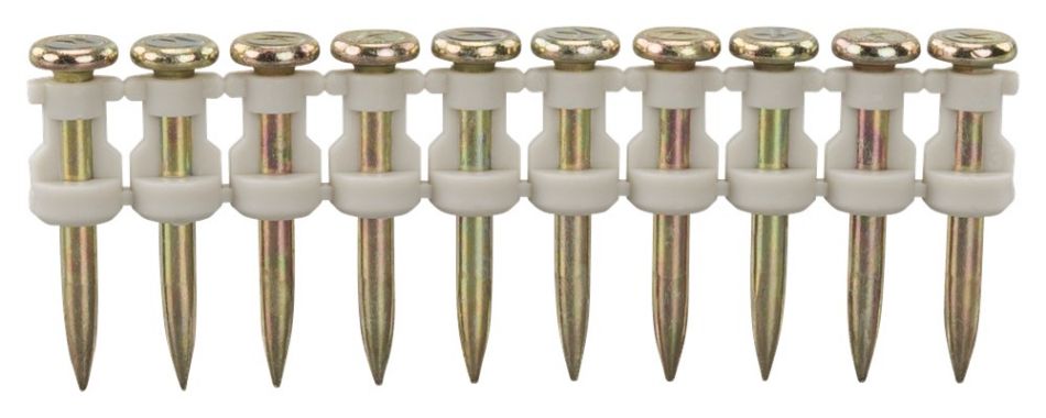 Betonnagels voor het bevestigen van metal stud en hout op beton voorzien van gegalvaniseerde coating. 1 gaspatroon meegeleverd. 10 nagels per strip. Het is ook mogelijk om de nagels op staal te bevestigen . Aanbevolen penetratie diepte per betonklasse: C16/20 25-28 mm C20/25 20-22 mm C25/30 15-20 mm C30/37 15-18 mm Aanbevolen penetratie diepte per staalsterkte: 350 N/mm2 6,5 mm Prijzen zijn aan verandering onderhevig.