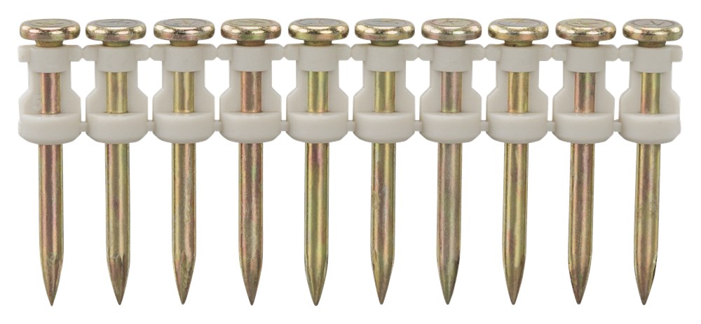 Betonnagels voor het bevestigen van metal stud en hout op beton voorzien van gegalvaniseerde coating. 1 gaspatroon meegeleverd. 10 nagels per strip. Het is ook mogelijk om de nagels op staal te bevestigen . Aanbevolen penetratie diepte per betonklasse: C16/20 25-28 mm C20/25 20-22 mm C25/30 15-20 mm C30/37 15-18 mm Aanbevolen penetratie diepte per staalsterkte: 350 N/mm2 6,5 mm Prijzen zijn aan verandering onderhevig.