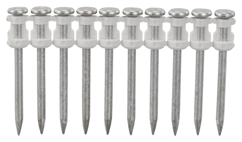 Betonnagels voor het bevestigen van metal stud en hout op beton voorzien van gegalvaniseerde coating. 1 gaspatroon meegeleverd. 10 nagels per strip. Het is ook mogelijk om de nagels op staal te bevestigen . Aanbevolen penetratie diepte per betonklasse: C16/20 25-28 mm C20/25 20-22 mm C25/30 15-20 mm C30/37 15-18 mm Aanbevolen penetratie diepte per staalsterkte: 350 N/mm2 6,5 mm Prijzen zijn aan verandering onderhevig.