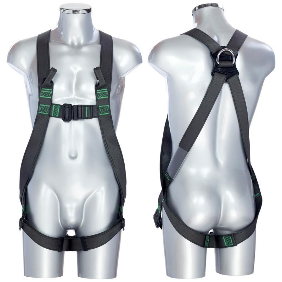 1 d-ring op de rugzijde 2 lussen op de borst. Met klassieke gespen.