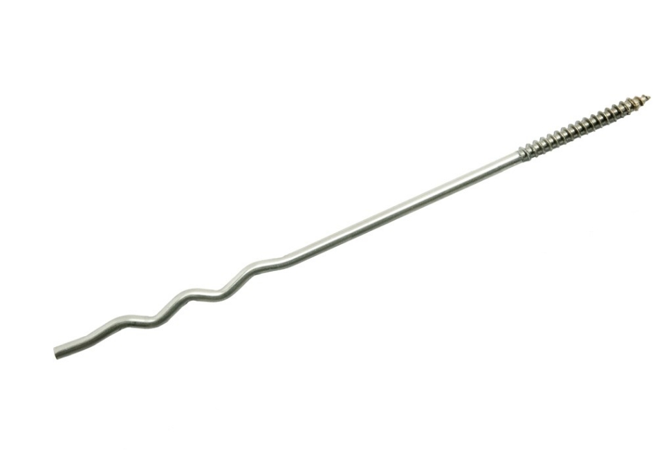 Spouwanker voorzien van houtdraad met punt dat met een indraaihulpstuk in een houtskeletbouw binnenwand wordt gedraaid, waarna de isolatie erop wordt geprikt (en met behulp van een isolatie clip op zijn plaats wordt gehouden) en vervolgens met het gegolfde uiteinde wordt ingemetseld in de buitenmuur.