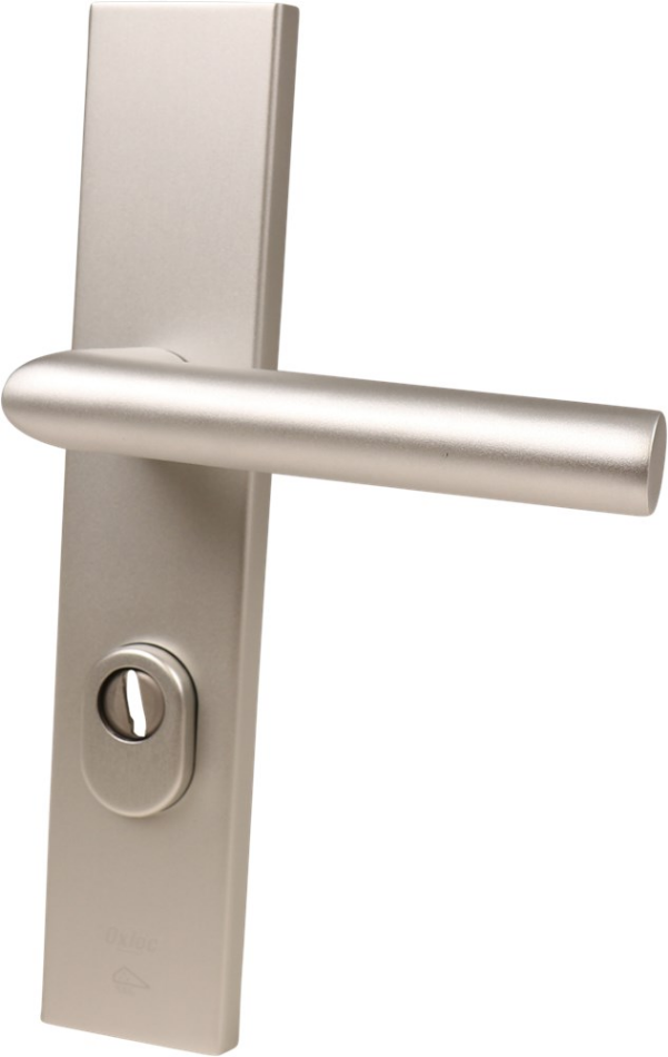 Veiligheidsgarnituur Oxloc aluminium F1 250x50mm deurdikte = 38-42mm kruk/kruk omkeerbaar. Kruk vastdraaibaar op recht schild met kerntrekbeveiliging SKG***