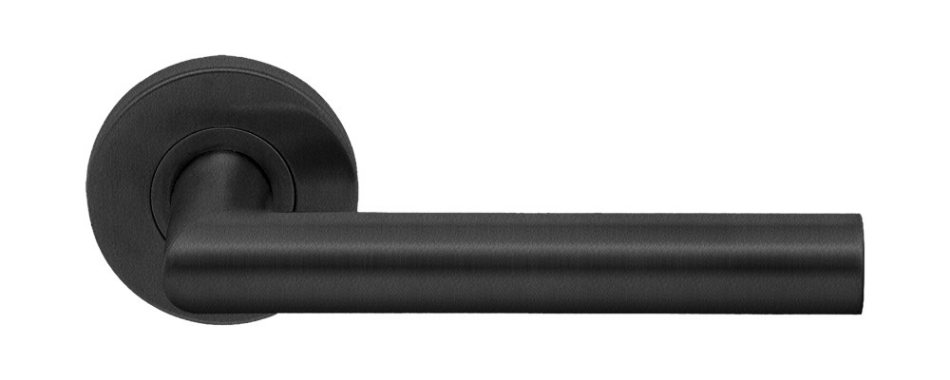 Model Tilburg (Haaks-model deurkruk). Rond rozet. Rvs AISI 304 (A2), zwart. Voorzien van stalen onderrozet geveerd. Brandwerend N1906 klasse 3 / EN1634.