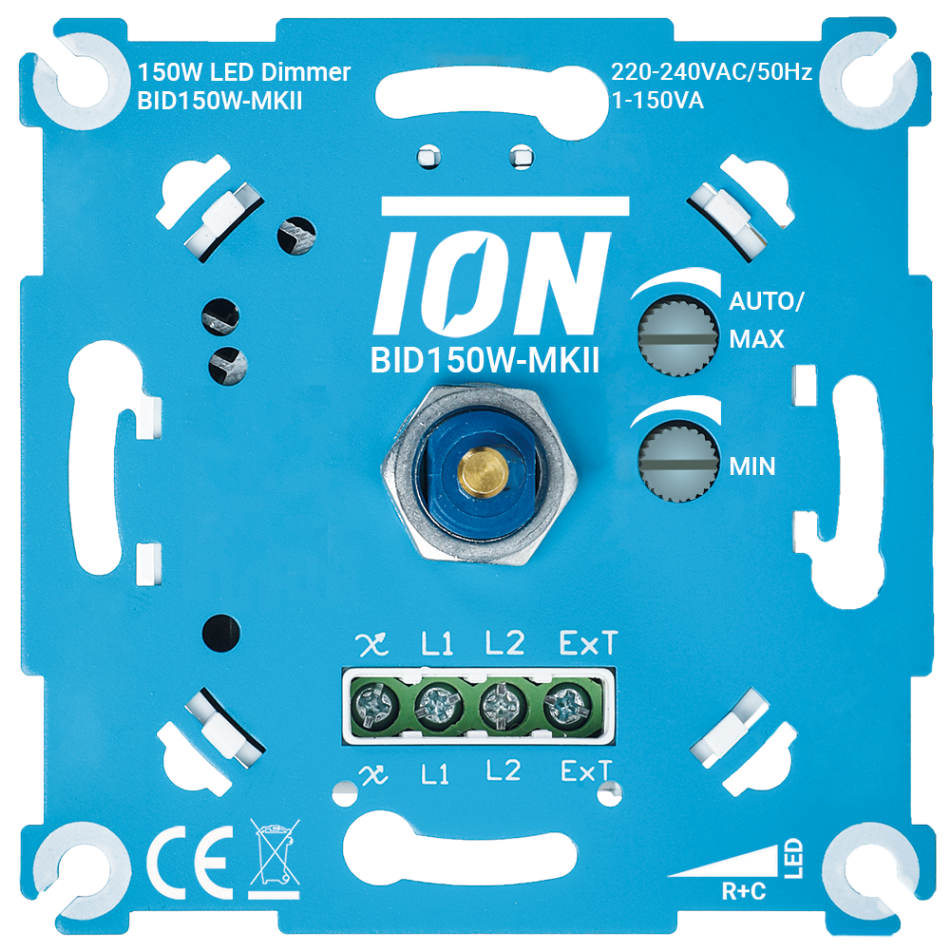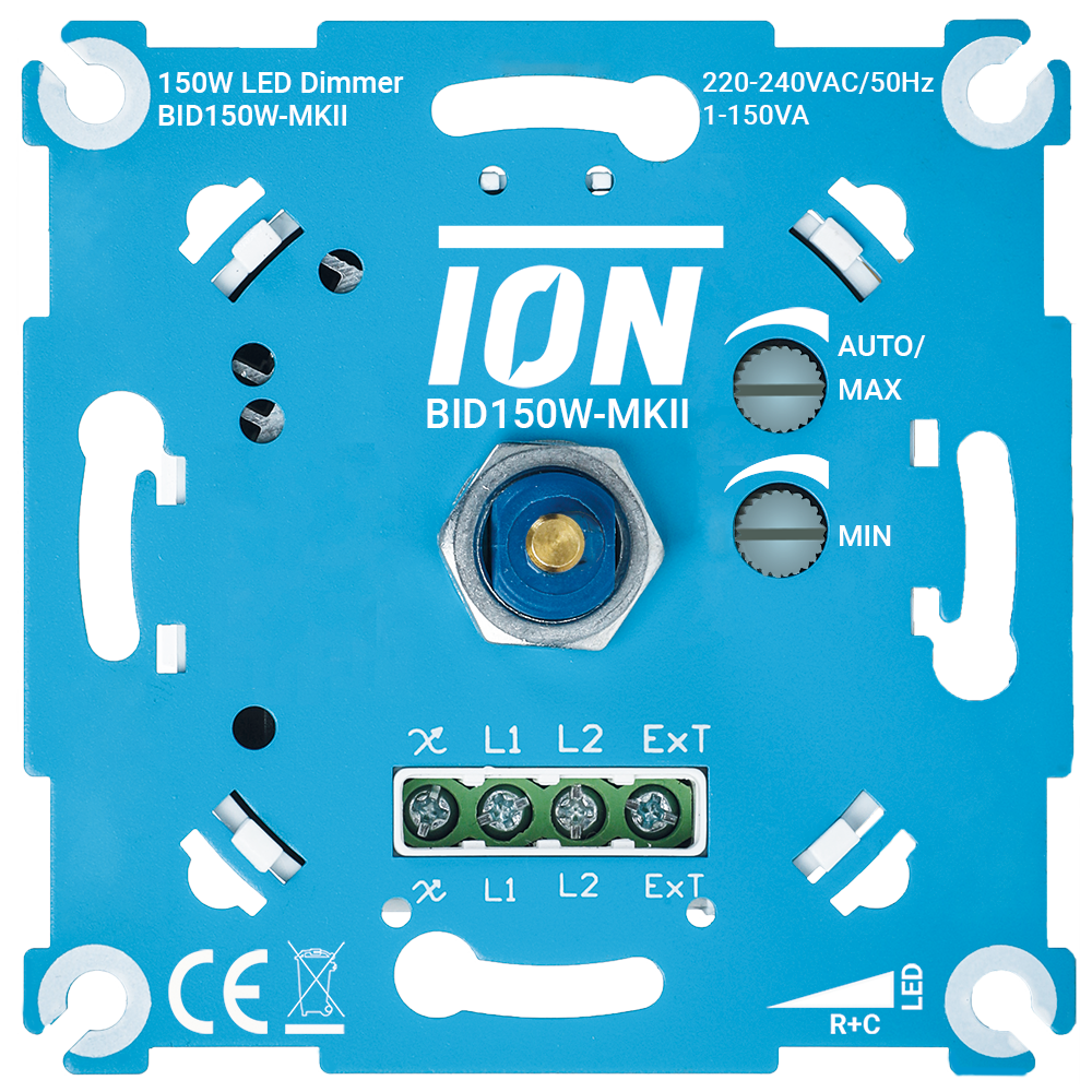 De iON LED Dimmer 150W-MKII is het Basis model van iON INDUSTRIES. Deze dimmer heeft diverse instelmogelijkheden waarmee u uw lampen perfect kunt afstellen. Daarnaast beschikt deze dimmer over een extra uitgang van 600W waarmee u een ander apparaat of lichtgroep kunt schakelen Deze LED Dimmer regelt automatisch de fase aansnijding of fase afsnijding. De LED Dimmer werkt dus altijd. Verder kunt u de minimale dimming en maximale dimming instellen middels stelschroeven. Daarnaast kunt u de LED Dimmer zo afstellen dat er geen flikkering meer ontstaat bij het dimmen van uw verlichting. Geschikt voor 0-150W, voor alle bekende merken frontplaten, beschermt tegen piekspanning, geruisloos dimmen.