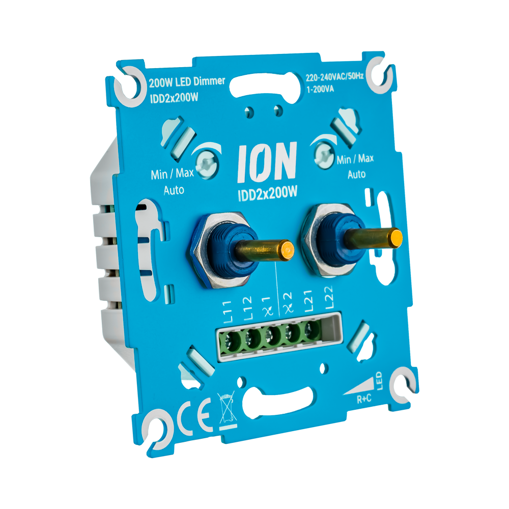 De ION IDD 2x200W LED Dimmer is de eerste echte dimmer met 2 uitgangen per dimkant van elk 200W speciaal ontwikkeld voor LED lampen.Deze Dimmer wordt gebruikt op locaties waar van 1 muuraansluiting met 2 schakelaars 2 dimmers gemaakt moet worden. De dimmer heeft uitgebreide instelmogelijkheden voor stabiel dimmen.Technische eigenschappen: Voltage 200-240VAC (50Hz). Type belasting LED & LED Drivers. Min/Max belasting 2 x 200VA Type dimming. Automatische detectie fase afsnijding of fase aansnijding. Afmeting: 71 x 71 mm (framemaat). Inbouwdiepte: 22 mm. Kortsluitingsbeveiliging: Ja, automatisch (zelf reset). Overbelastingsbeveiliging: Ja, automatisch. Thermische bescherming: Ja, automatisch. Instelbaar minimaal en maximaal dim-niveau. Geschikt voor merken: Jung,Gira, Busch-Jaeger, Merten by Schneider, PEHA