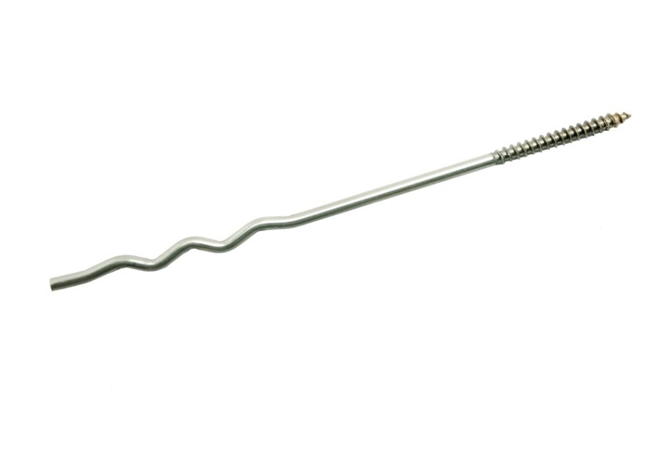 Spouwanker voorzien van houtdraad met punt dat met een indraaihulpstuk in een houtskeletbouw binnenwand wordt gedraaid, waarna de isolatie erop wordt geprikt (en met behulp van een isolatie clip op zijn plaats wordt gehouden) en vervolgens met het gegolfde uiteinde wordt ingemetseld in de buitenmuur.