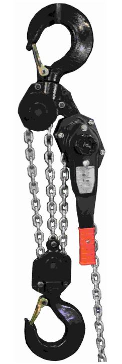 W.L.L. 9000, gewicht 43kg, stand. hijsh. 1,5m, haak opening 61 mmm, kracht op hevel 380 N, ketting diameter 9x27, min. bouwh. 635mm.