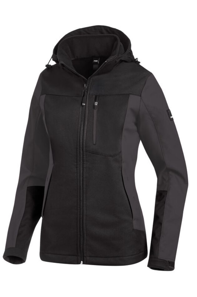 Softshelljack dames, zeer waterafstotend, winddicht en ademend, high-performance, 10.000 mm waterkolom, 5.000 g/m². in 24 uur, rekbaar en extreem soepel FHB softshell-materiaal voor maximale bewegingsvrijheid, 1 borstzak en 2 grote zijzakken met ritssluiting, afneembare capuchon met wijdteverstelling, typisch FHB- designelement op de onderarm, nauwsluitende pasvorm, arm- en tailleverstelling.