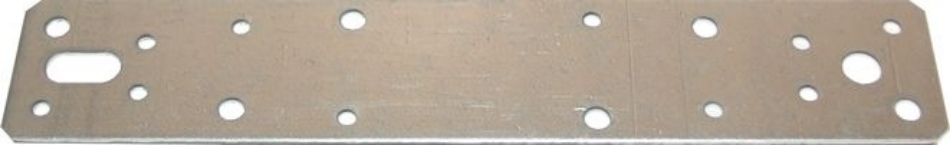 Rechthoekige koppelplaat met gevarieerd (slob)gatenpatroon om houten balken en/of regels vlak met elkaar te verbinden. Koppelplaten zijn leverbaar in verschillende maten en uitvoeringen.
