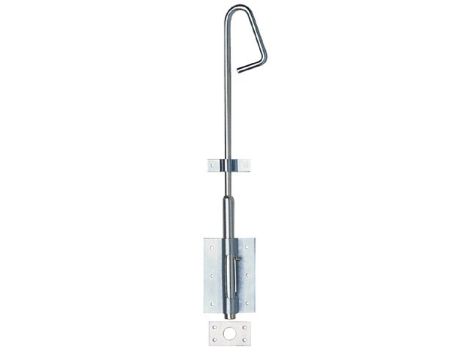 Staartgrendel voor het vastzetten van grote deuren waarbij de pen tot 50 mm in het plafond of een balk boven de deur wordt vastgezet.