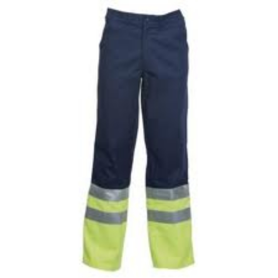 Verdekte ritssluiting, 2 ingezette zijzakken waarvan 1 met gsm-zakje, achterzak met knoop, duimstokzak, kniezakken, reflectieband