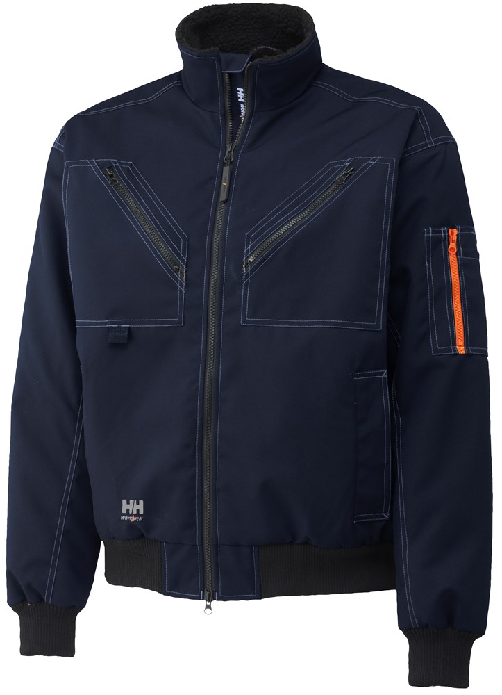 Twee voorzakken met drukknopen, twee borstzakken met rits, mouwzak met rits en pennenzak en binnenzak