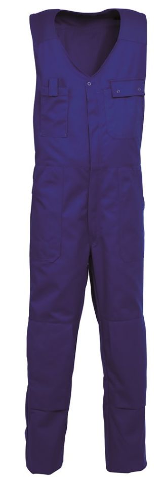 Verdekte ritssluiting met drukknopen, 2 zijzakken, 2 intasten, borstzak met klep, pennenzakje, gsm-zakje, achterzak met klep, duimstokzak met rolmaatzakje, kniezakken, elastiek in rug, elastisch schouderpand