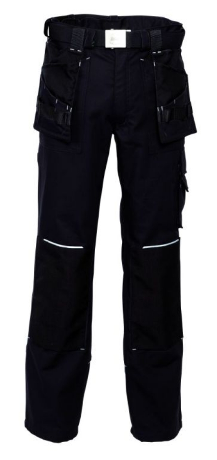 Verdekte ritssluiting, 2 zijzakken, 2 loshangende voorzakken, 2 achterzakken, duimstokzak, dijbeenzak met klep en gsm-zakje, verstelbare cordura® kniezakken, riem, cordura® versterkingen, hamerlus, reflecterende piping