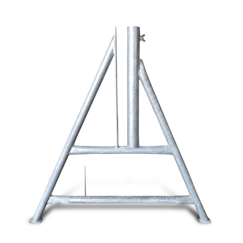 Verzinkte A-standaard voor schrikhekken met u-profiel.De standaard is voorzien van een buispaalhouder voor een buispaal met een doorsnede van 48mm, waaraan een verkeersbord bevestigd kan worden.