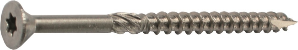 Rvs AISI 304 (A2), met extra diepe torx aansluiting voor een betere grip van de schroefbit. De spoed van de schroef is voorzien van golfsnedeprofiel tot in de punt; voor sneller en lichter indraaien. Met extra schroefdraad onder de kop, hierdoor trekt de schroef extra aan voor een blijvend sterke constructie. Zonder voorboren (hard)houten vlonderconstructies maken. Geschikt voor hardhout, o.a. Bankirai, met een maximum gewicht van 1.100 kg/m³. Voorzien van freesribben en cutpoint.