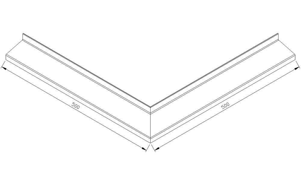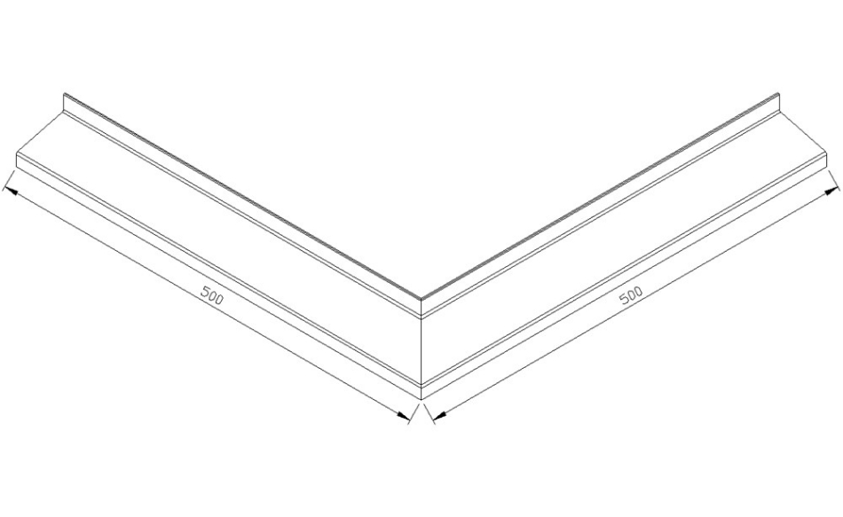 Uitwendig hoekstuk van 90 graden. Lengte: 500 mm, breedte: 500 mm, hoogte neus: 15 mm, hoogte aanslag: 20 mm.