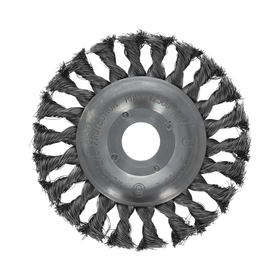 Rondborstels voor de haakse slijper. De Industrial Line met getordeerd staaldraad is geschikt voor het ontroesten en ontbramen van laag- en ongelegeerde staalsoorten.
