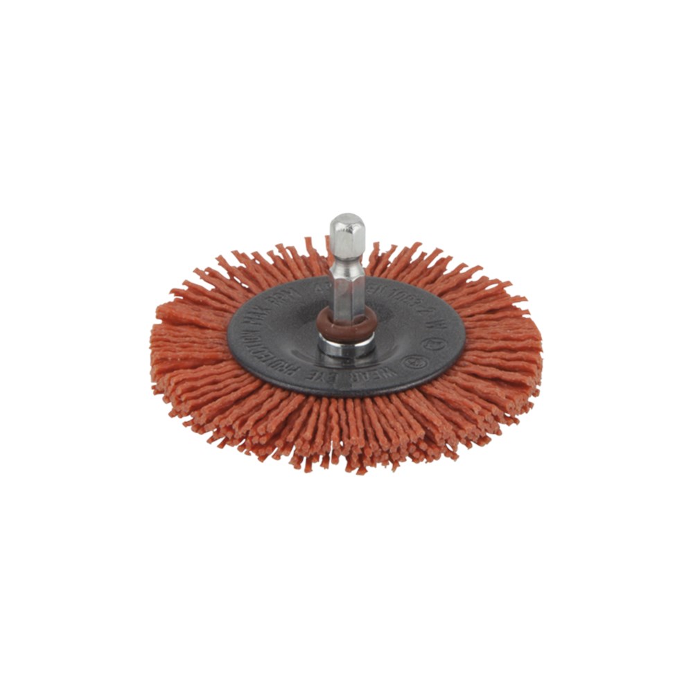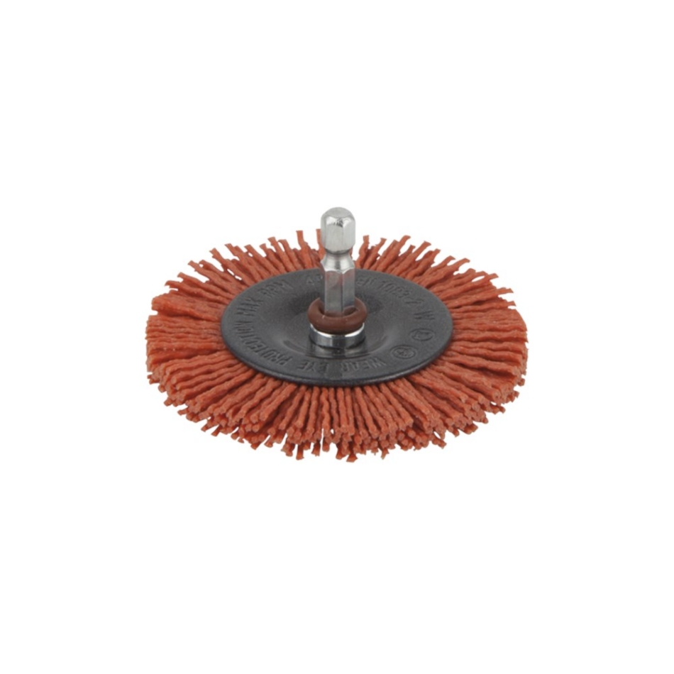 Nylondraad-schijfborstel, agressief.Ø 75 mm, Zeskantschacht SW 6,35 mm (¼"). Lengte schacht 25 mm. Lengte draad 15 mm. Diameter draad 1,2 mm. Nylondraad. Rood. Gegolfd. Toerental max. 4.500 RPM. Rechtsdraaiend. Voor het reinigen, ontroesten en polijsten. Langere levensduur dan staalborstels. Agressief door toepassing van grofkorrelig nylondraad. Goed geschikt Hout. Voorwaardelijk geschikt Metaal, Non-ferrometaal, Plaat, Steen