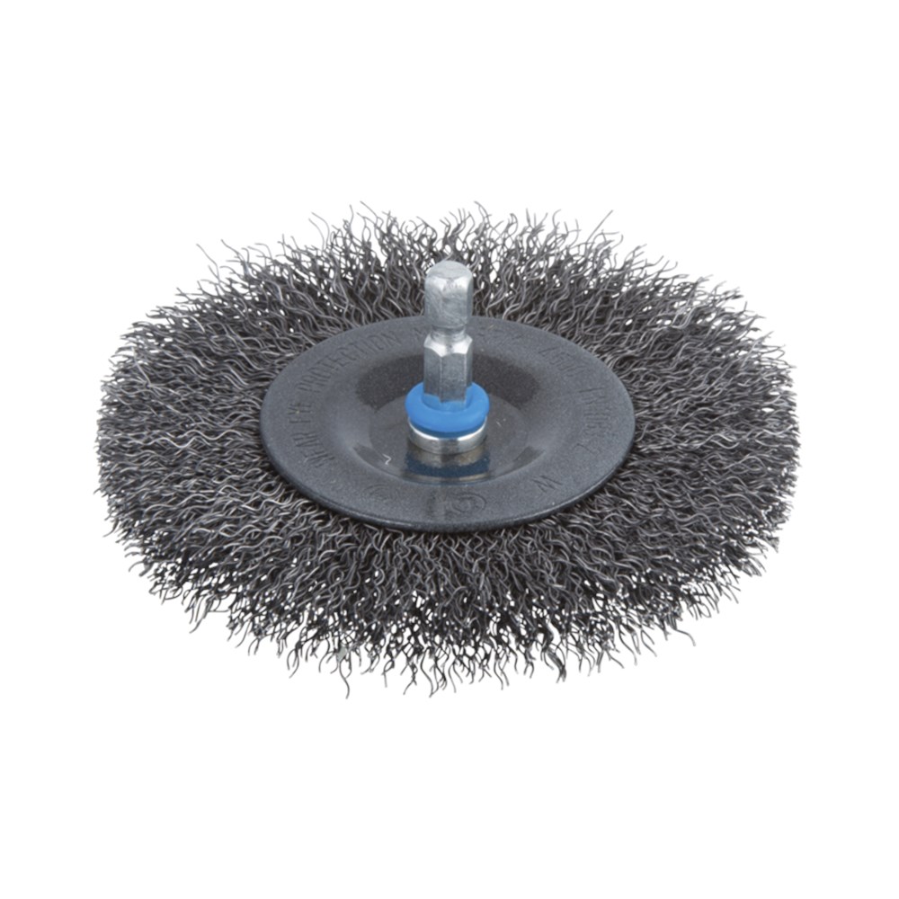 Staaldraad-schijfborstel. Ø 100 mm. Hoogte bezetting10 mm. Schacht zeskant. Lengte draad 23 mm. Voor ontroesten en reinigen . Ter voorbereiding van soldeer- en laswerkzaamheden. Goed geschikt Metaal, Plaat . Voorwaardelijk geschikt Non-ferrometaal, hout, Steen