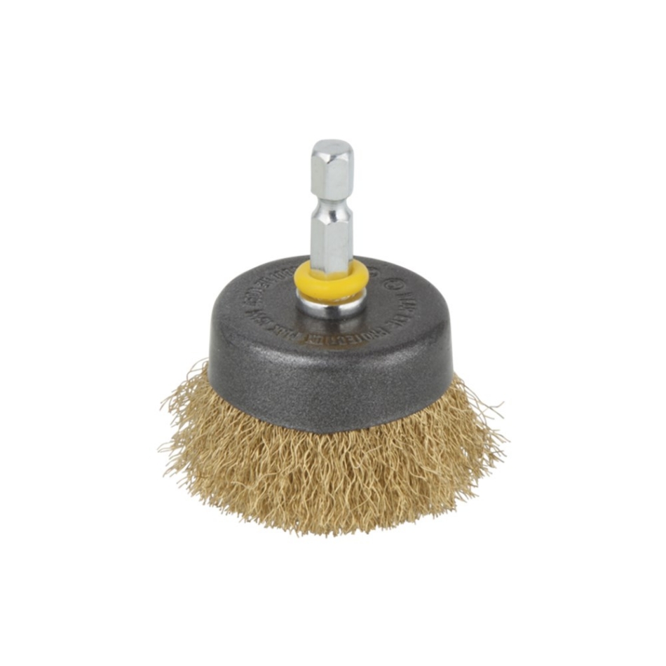 Messingdraad-komborstel. Ø 50 mm. Lengte draad 15 mm. Diameter draad 0,2 mm. Zeskantschacht SW 6,35 mm (¼"). Messingdraad. Toerental max. 4.500 RPM. Rechtsdraaiend. Voor alle fijne schuur- en polijstwerkzaamheden.Goed geschikt Non-ferrometaal. Voorwaardelijk geschikt hout, Steen, Plaat, Metaal.