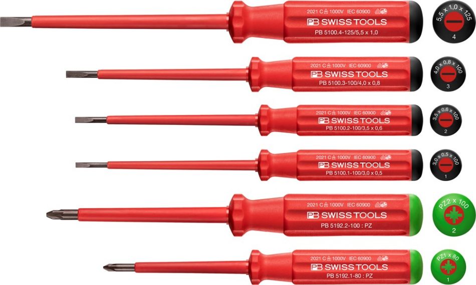 Classic VDE schroevendraaierset voor gleufkop- en Pozidriv-schroeven. Volledig geïsoleerd tot 1000 V AC / 1500 V DC volgens IEC/EN 60900. VDE gekeurd, veilig werken tot 1000 volt AC / 1500 volt DC. Slank hecht, plaatsbesparend.
