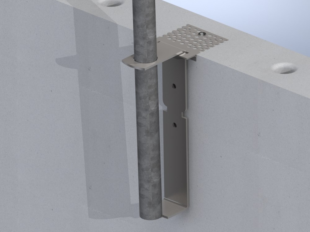 Montageplaat voor Aboma gecertificeerde montage van een RB-Beugel met een gespijkerde spanhuls op de kop van de kalkzandsteenmuur. Niet geschikt voor toepassing bij kanaalplaatvloeren.