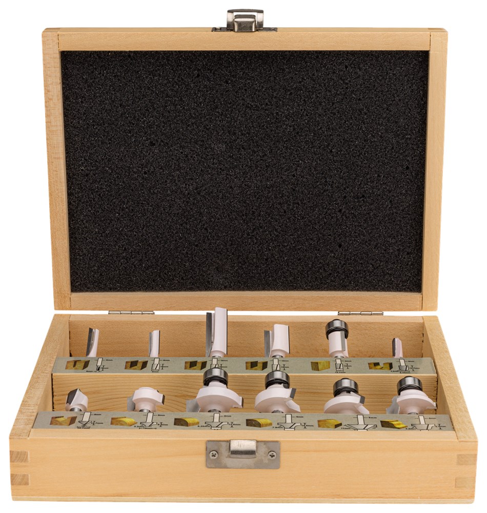 12-delige Makita frezenset met schachtdiameter 6mm in houten kist. De set bestaat uit 4x groeffrees, kopieerfrees, holprofielfrees, V-groeffrees, afrondfrees zonder kogellager, afrondfrees met kogellager, fasefrees met kogellager en Romeinse ogieffrees met kogellager.