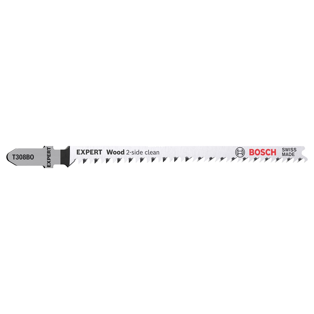 Ervoor zorgen dat de 'schone kant' van een decoupeerzaag op het zichtbare deel van het werkmateriaal zit, is altijd een kunst geweest voor schrijnwerkers en houtbewerkers. Soms kun je het werkstuk omdraaien en soms kan de decoupeerzaag zelf ondersteboven worden gehouden. Of je kunt de EXPERT 'Wood 2-side clean' gebruiken, die aan beide kanten perfect splintervrij zaagt dankzij de dubbele rij tanden. Met zijn extrascherpe precisiegeslepen tanden is het Bosch EXPERT 'Wood 2-side clean' decoupeerzaagblad zeer geschikt voor het zagen van zachthout tot 50 mm dik. Meubelmakers krijgen een perfecte afwerking en verliezen geen tijd met schuren na elke decoupeerzaagsnede. Beschikbaar voor rechte zaagsneden (T308B), voor gebogen zaagsneden (T308BO) en voor nauwkeurige hoekzaagsneden (T308BP)