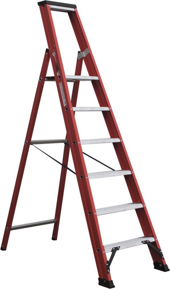 Type: MAGNUS Model Magnus. Aluminium rood polyester gecoat. Geschikt voor professioneel gebruik, eenzijdig oploopbare trap. Voorzien van gereedschapsbakje, scharnierend platform, gesloten treden van 12 cm, ondersteund door gefelste sporten en extra versteviging onder de eerste trede voor extra stabiliteit. * Inclusief spreidstandbeveiliging d.m.v. banden.