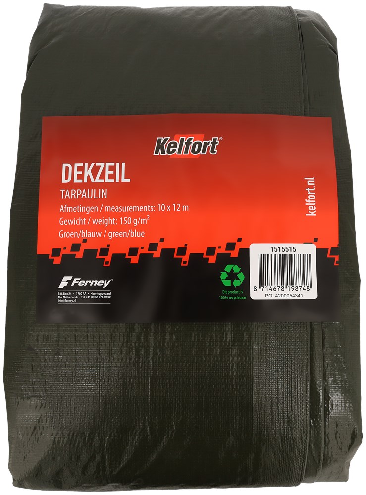 Lagedichtheid polyethyleen, geweven en gecoat aan beide zijden. Voorzien van omzoomde rand, met ogen. Kleur blauwgroen, 150 g/m².