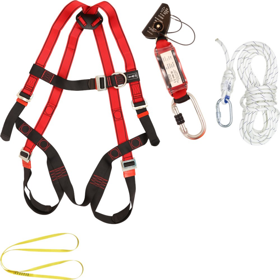 Set bestaat uit een harnas met 2 bevestigingspunten (type Static Two), een kernmantellijn van 10 m met karabijnhaak, een Sling 1200 om een tijdelijk bevestigingspunt te creëren en een Rope grab met valdemper. Inclusief tas.