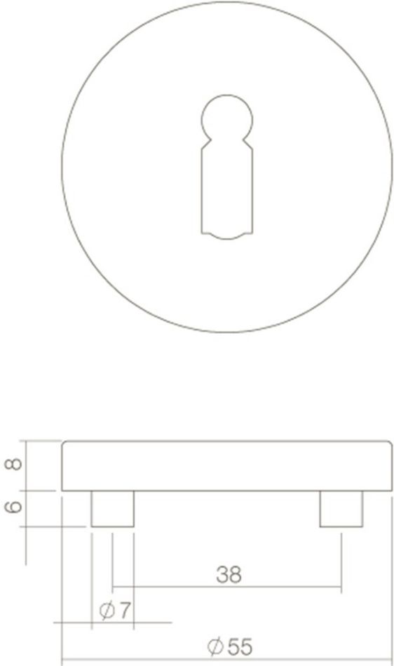 Deze ronde rozet met sleutelgat is uitgevoerd in roestvast staal, door een geborstelde behandeling heeft deze rozet een matte uitstraling. De maatvoering is Ø 55 mm en is voorzien van nokken. Deze rozet wordt per stuk geleverd.