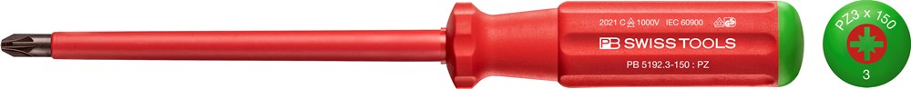 Classic VDE schroevendraaier voor Pozidriv-kruiskopschroeven. Volledig geïsoleerd tot 1000 V AC / 1500 V DC volgens IEC/EN 60900. VDE gekeurd, veilig werken tot 1000 V AC / 1500 V DC. Slank hecht, plaatsbesparend en ideaal voor fijn afstelwerk.