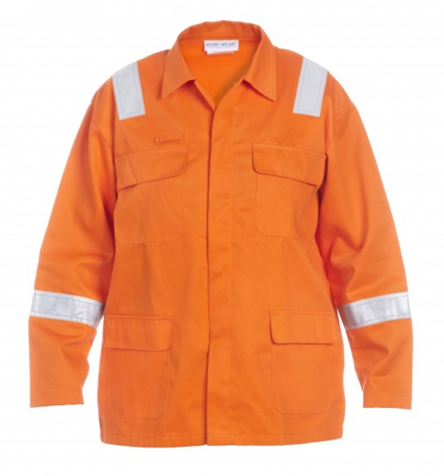 Werkjas. Verdekte drukknoopsluiting. 2 Borstzakken. 2 Steekzakken. Gasdetectielus. 2 Manchetten verstelbaar met drukknopen. Offshore reflecterende striping.