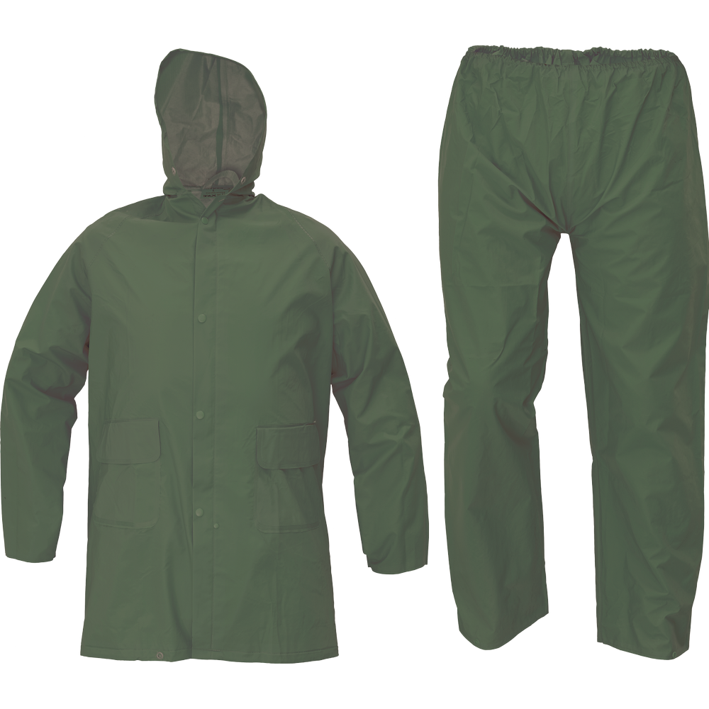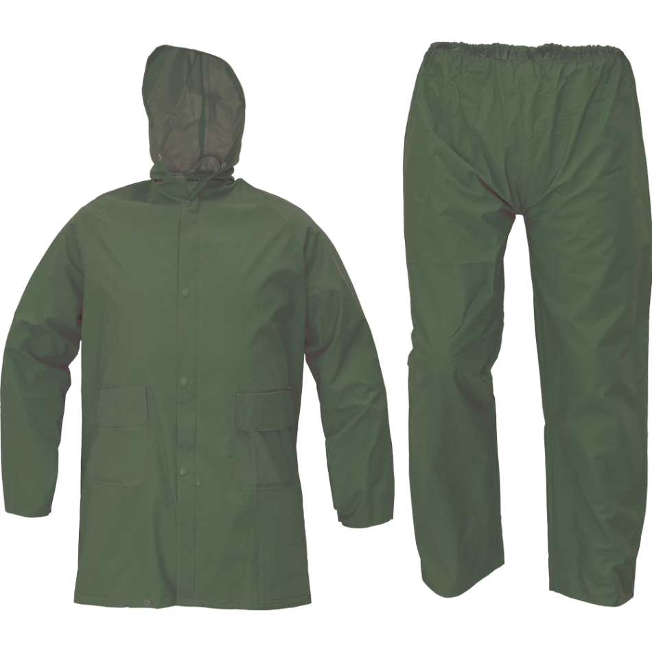 Tweedelig, beschermend pak met capuchon; 3/4 overjas met een capuchon in de kraag; broek met taille van elastisch rubber; getapete naden; PVC-coating; 2 voorzakken met klep; mouwzomen drukknoop aanpassing; onderarm en achterkant ventilatie.