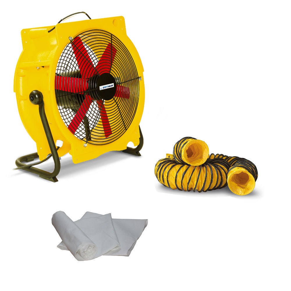 De Dryfast stofafzuigunit DFV4500HPLSAU bestaande uit: hoge druk axiaal ventilator DFV4500HP, 2 x slangaansluitconussen SA 4500/450, stofopvangzak SZ3/550 en aanzuigslang LTS450 10 meter.