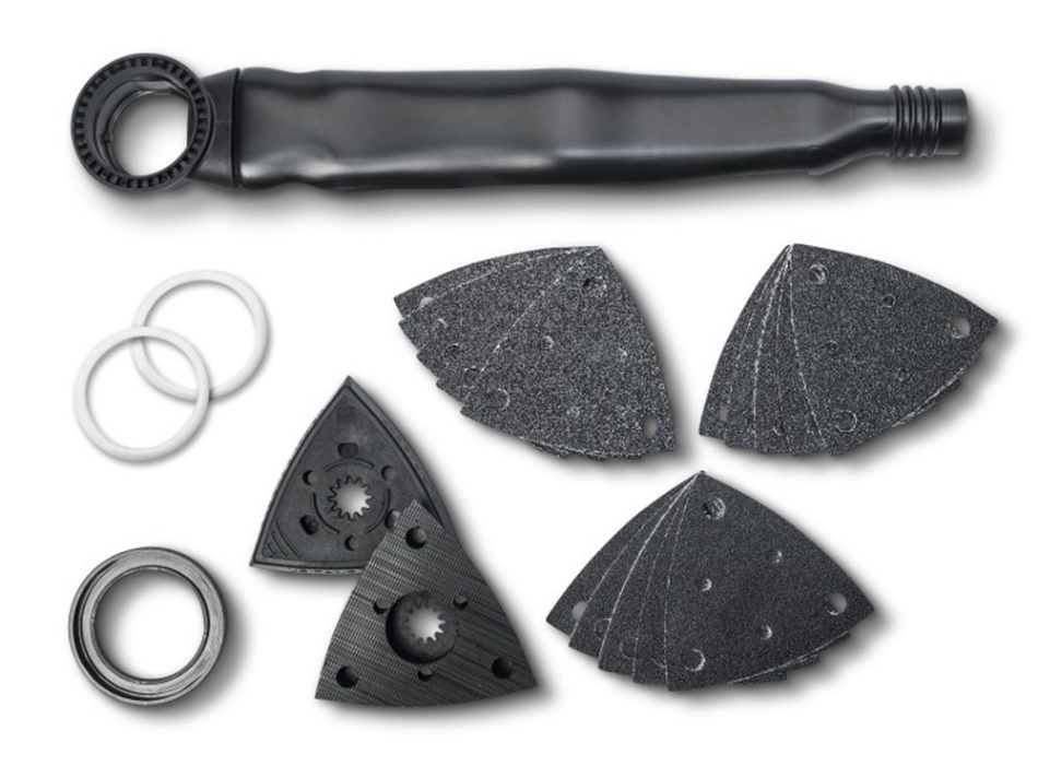 2 schuurplateaus. geperforeerd telkens 5 vel schuurpapier. geperforeerd. korrel 60. 80. 120 1 afzuigkap met zuigbuis 1 adapter 2 viltafdichtingen. Voor MultiMaster FMM 350 Q / QSL.