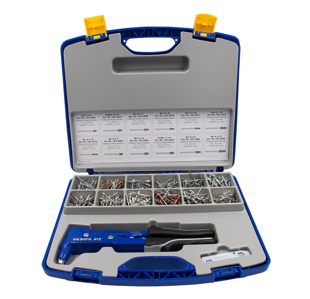 De GESIPA assortimentskit NTX is ideaal voor de servicemonteur onderweg. De stalen koffer bevat een assortiment blindklinknagels inclusief de compacte handtang GESIPA NTX. Inhoud koffer: Handtang GESIPA NTX Blindklinknagels: 100 st. ALU/ST 3,0 x 5,0 100 st. ALU/ST 3,0 x 6,0 80 st. AL/ST 3,0 x 8,0 80 st. AL/ST 3,0 x 10,0 70 st. AL/ST 3,0 x 12,0 80 st. AL/ST 4,0 x 5,0 80 st. AL/ST 4,0 x 6,0 70 st. AL/ST 4,0 x 8,0 60 st. AL/ST 4,0 x 10,0 60 st. AL/ST 4,0 x 12,0 90 st. Koper/ST 3,0 x 6,0 70 st. Koper/ST 4,0 x 6,0