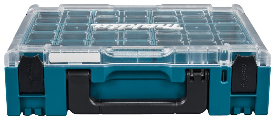 Makita Mboxen, CoolMboxen en gereedschapskisten. Handige Mbox organizer met transparant deksel. Deze koffer kan naar eigen wens ingedeeld worden door middel van de 13 meegeleverde inzetbakken in diverse maten. Uiteraard is deze Mbox ook stapelbaar met reguliere Mboxen. Voorzien van handgreepvergrendeling en handig doorzichtig deksel zodat verbruiksartikelen snel te herkennen zijn.