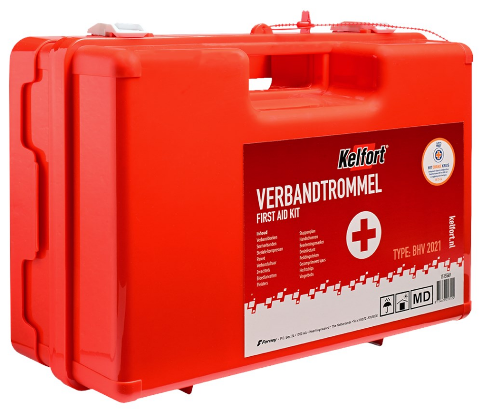 Verbandkoffer en beugel zijn van slagvast kunststof en stof- en spatwaterdicht.