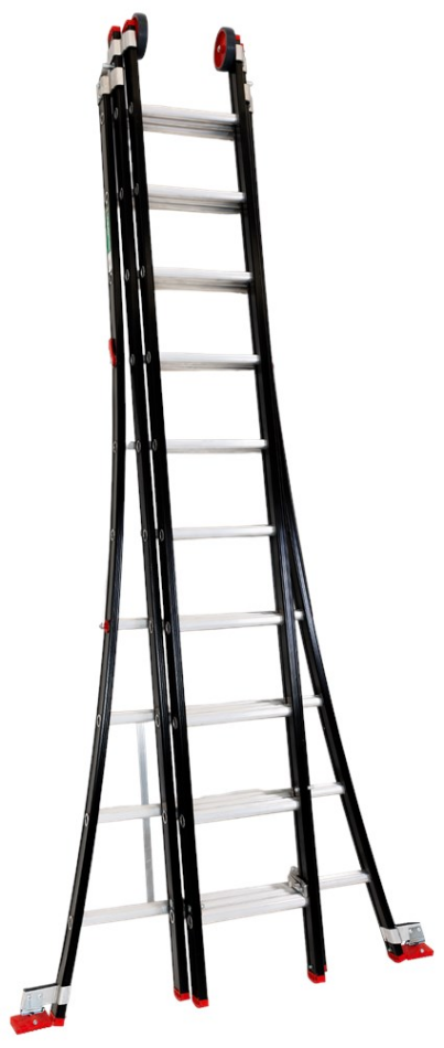 Model Magnus. 3-delige, professionele zwart polyester gecoate reformladder voorzien van uitgebogen bomen en starre spreidbeveiliging. De trapbomen bestaan uit een naadloos geëxtrudeerd aluminium kokerprofiel met aan de binnenzijde een smal gedeelte waartussen de sporten zijn ingeklemd. Met brede 28 mm sporten en tussen elke sport 250 mm afstand. De sport is aan de onderkant afgerond en aan de bovenkant vlakgeribd als een antislipbeveiliging.