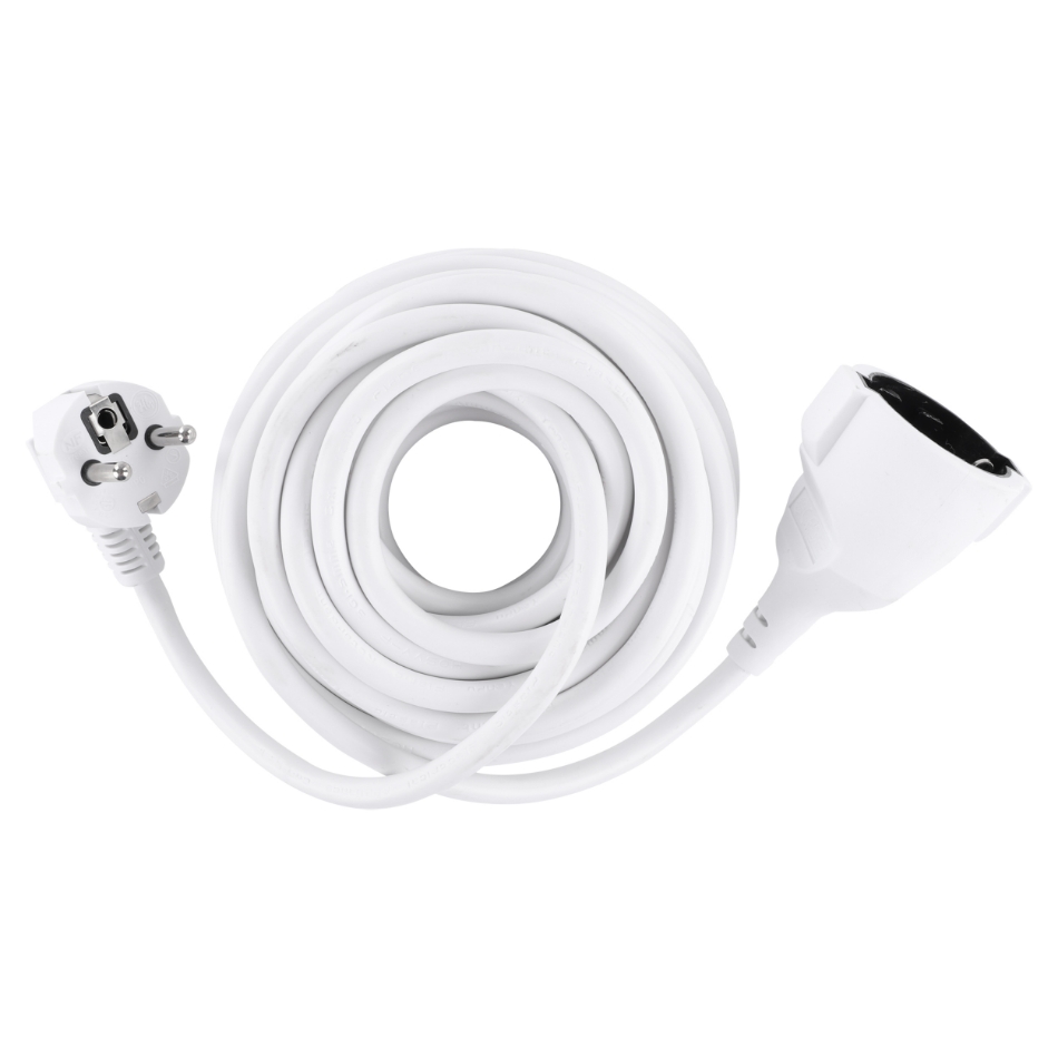 Witte verlengsnoer met randaarde. Snoer is gemaakt van vinyl, heeft een lengte van 10 meter en een doorsnede van 3 x 1.5 mm². Ontworpen voor binnengebruik in droge ruimten voor huishoudelijke doeleinden Maximaal vermogen van 3680 Watt.