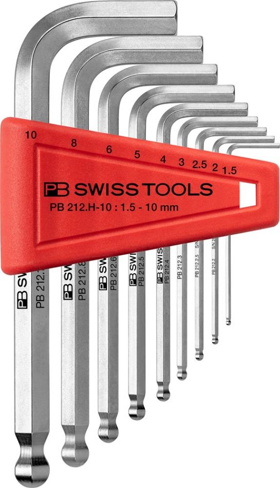 Inbussleutels met kogelkop voor binnen-zeskantschroeven, set in praktische houder. De kogelkop maakt het draaien van de schroeven tot onder een hoek van 30° mogelijk. Speciale legering met buitengewone elasticiteit bij hoge hardheid.