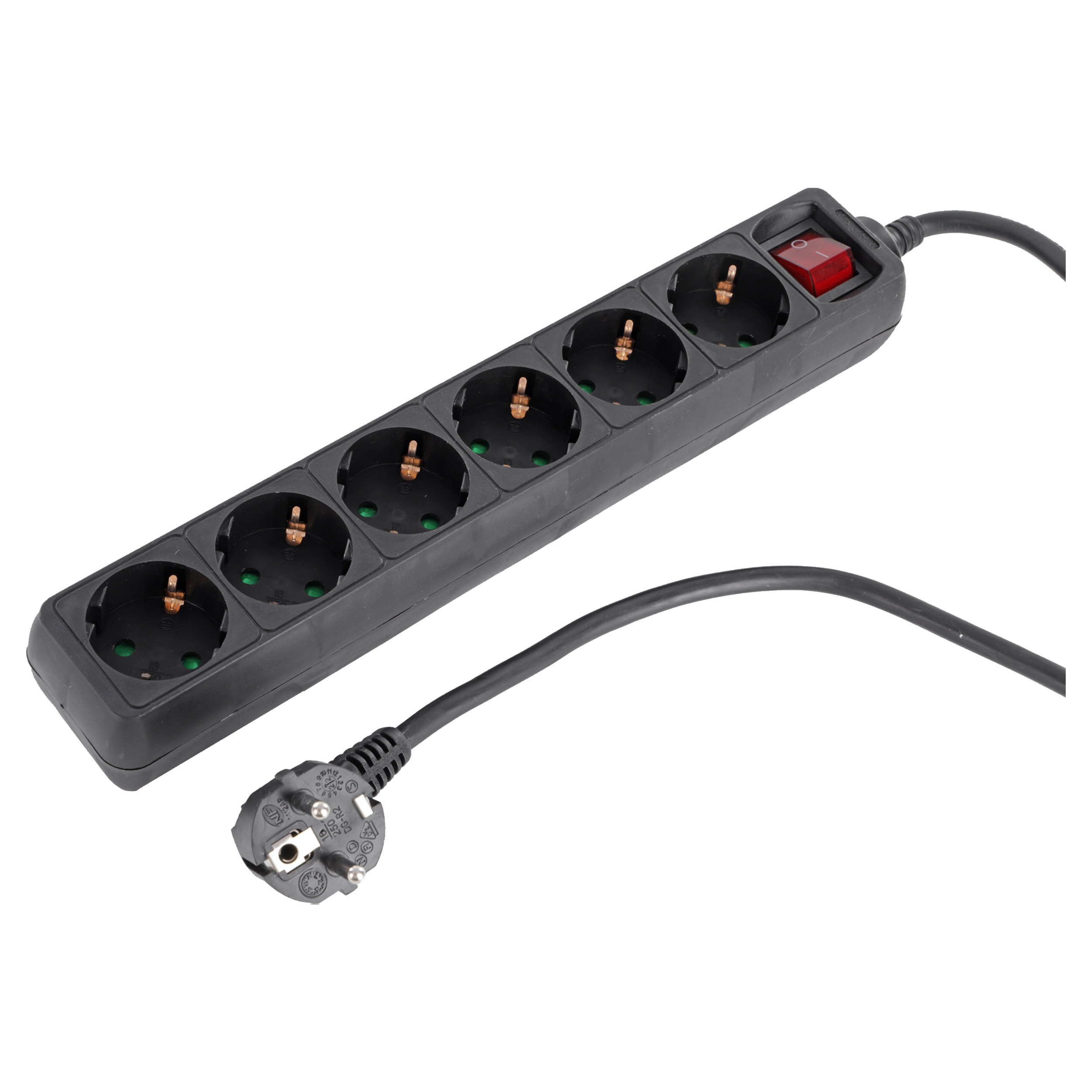 6-voudige stekkerdoos met randaarde. Met schakelaar. Alleen voor binnengebruik in droge ruimten. Alleen voor huishoudelijke doeleinden. Maximaal 3680 Watt.